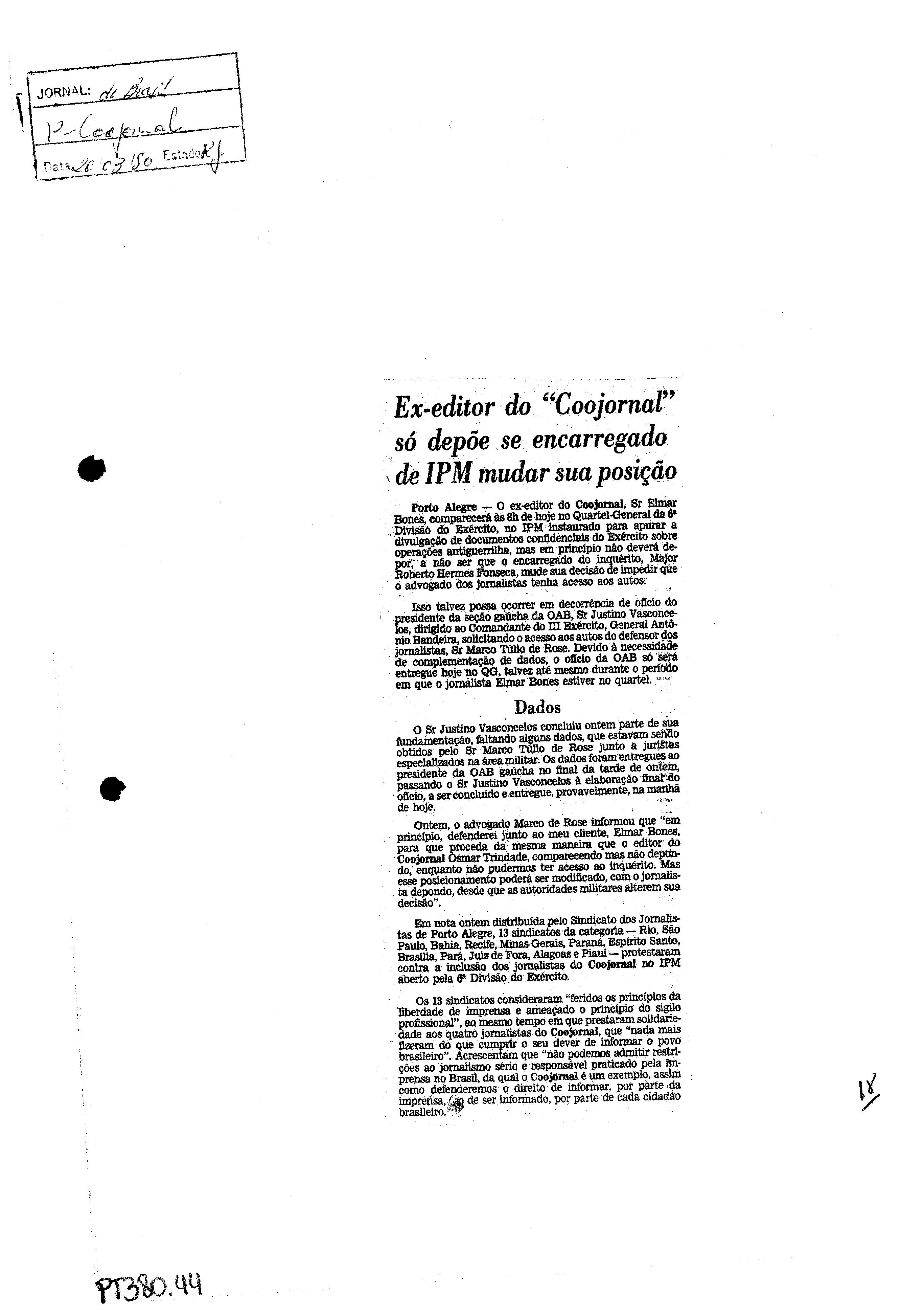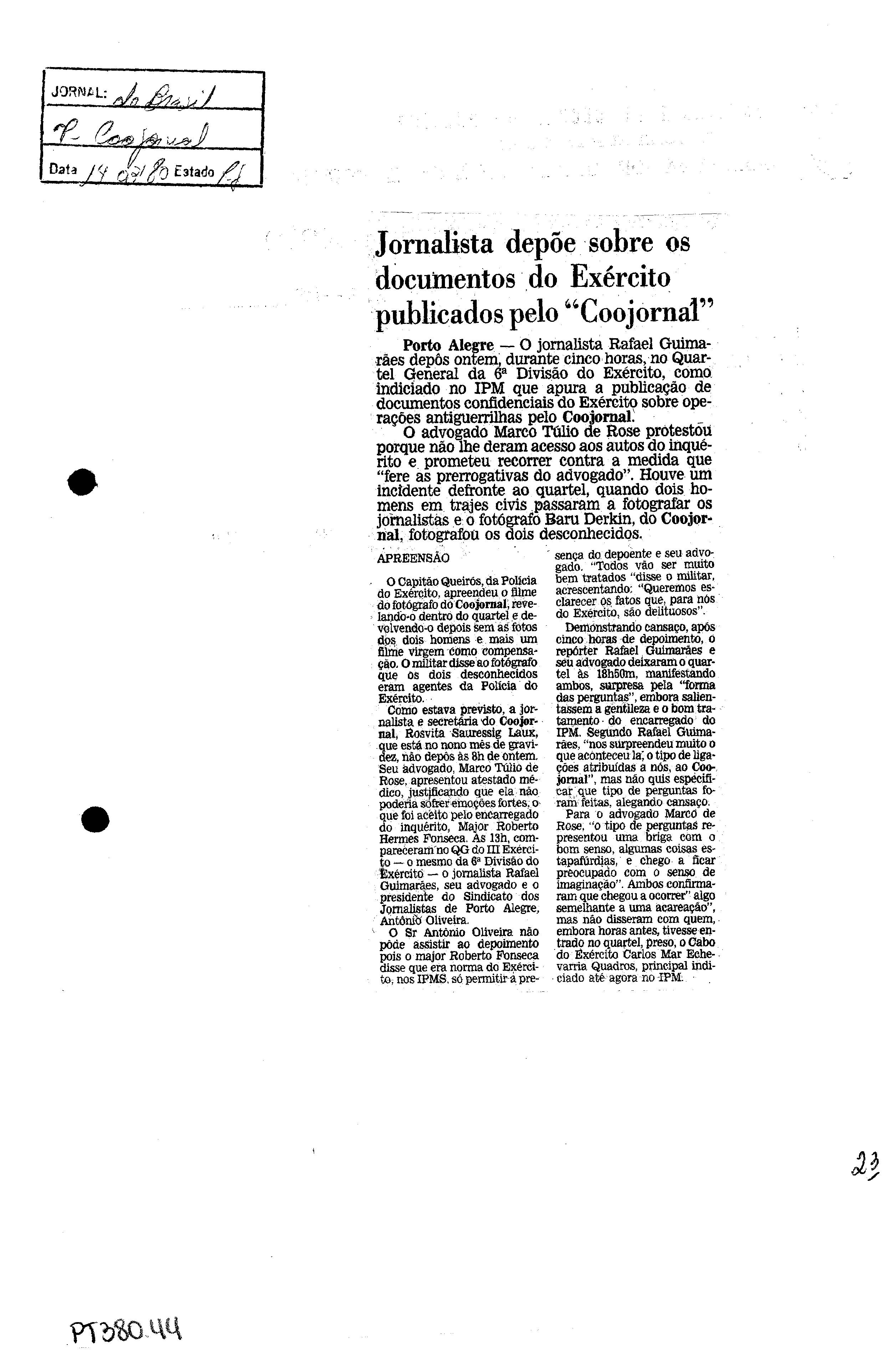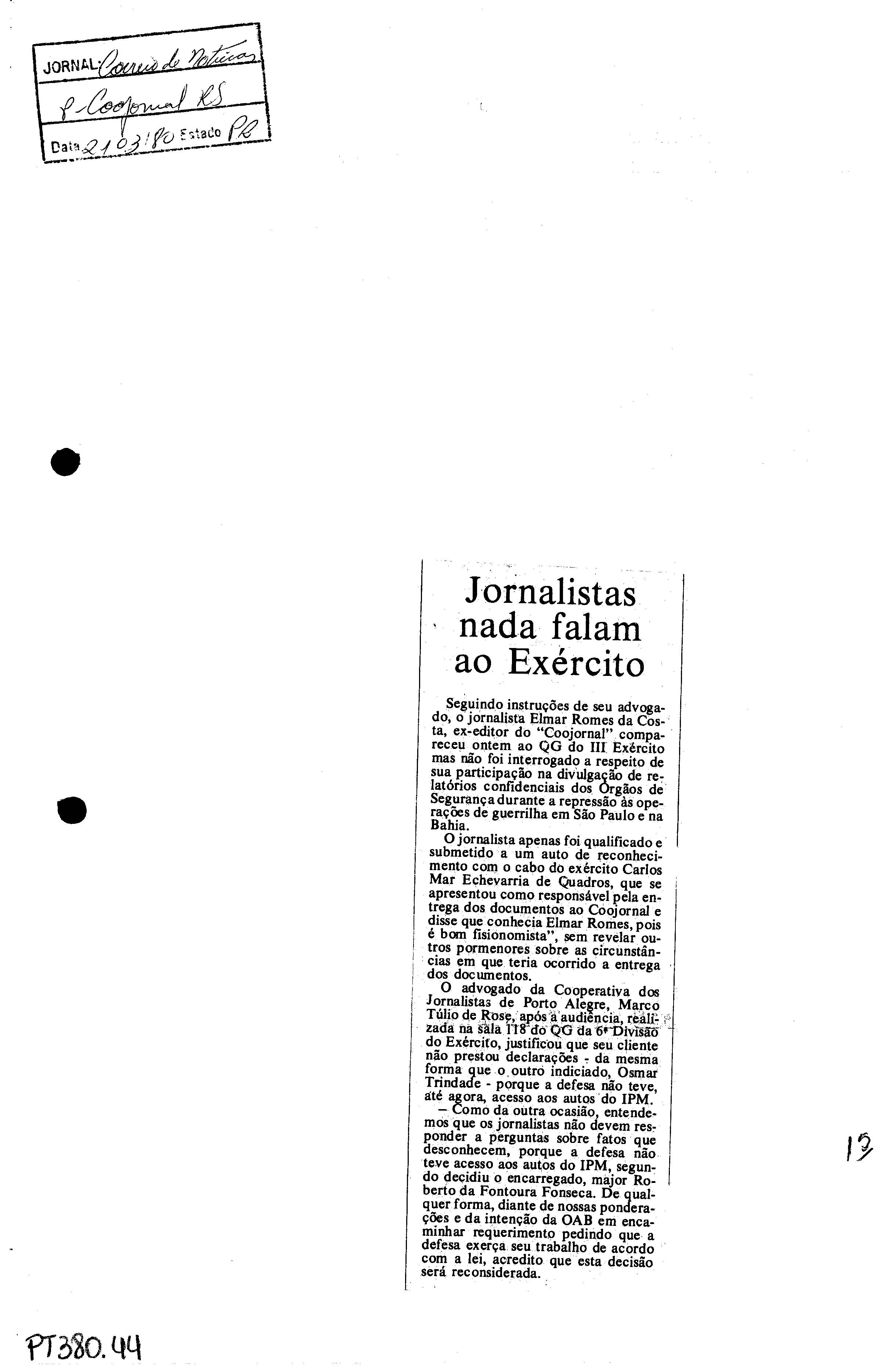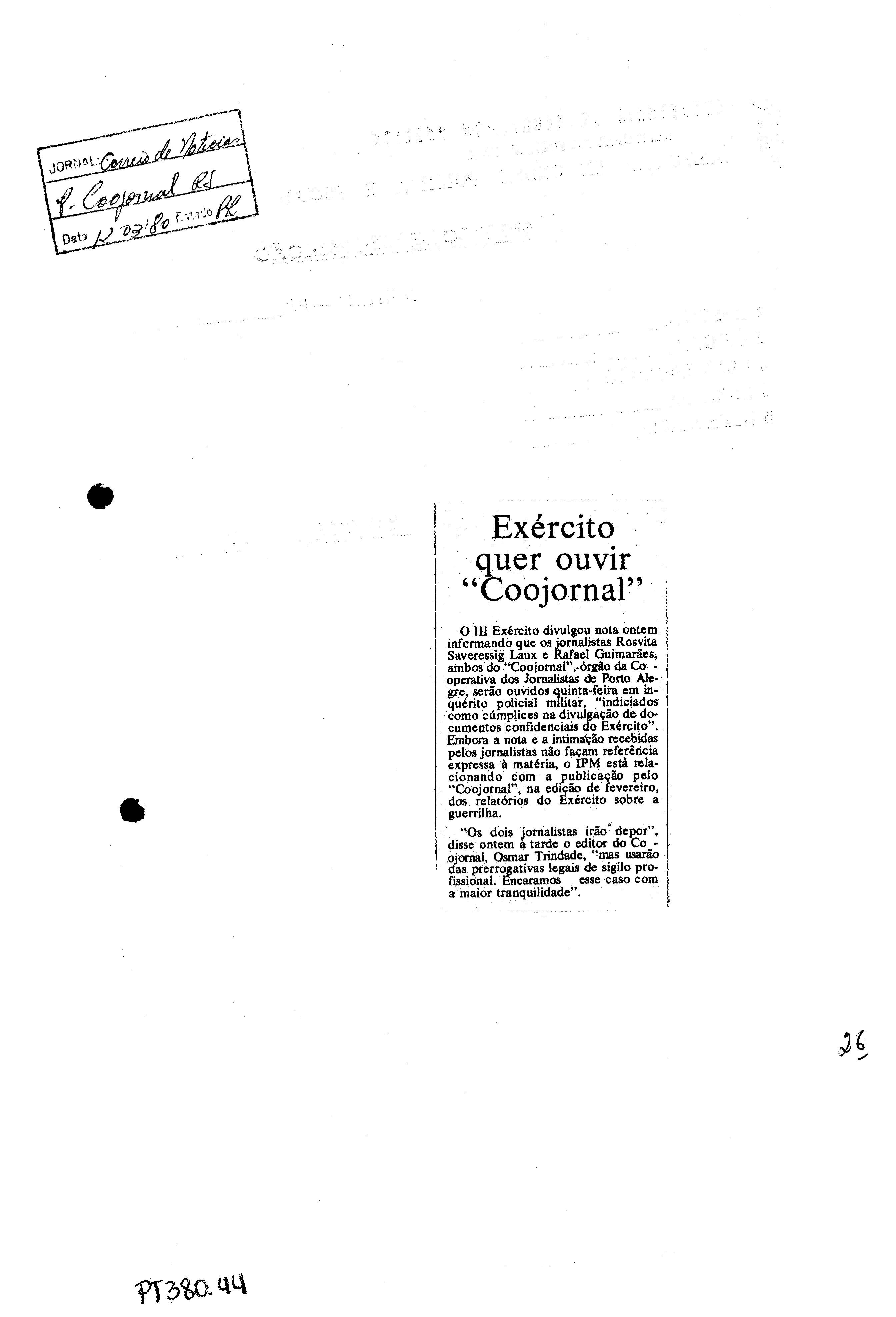 VOCÊ ESTÁ AQUI: HOME » REPRESSÃO » FORÇA S ARMADAS » NOTÍCIAS DAS PRISÕES DOS JORNALISTAS DO COOJORNAL, A IMPRENSA QUE RESISTIU À DITADURA
