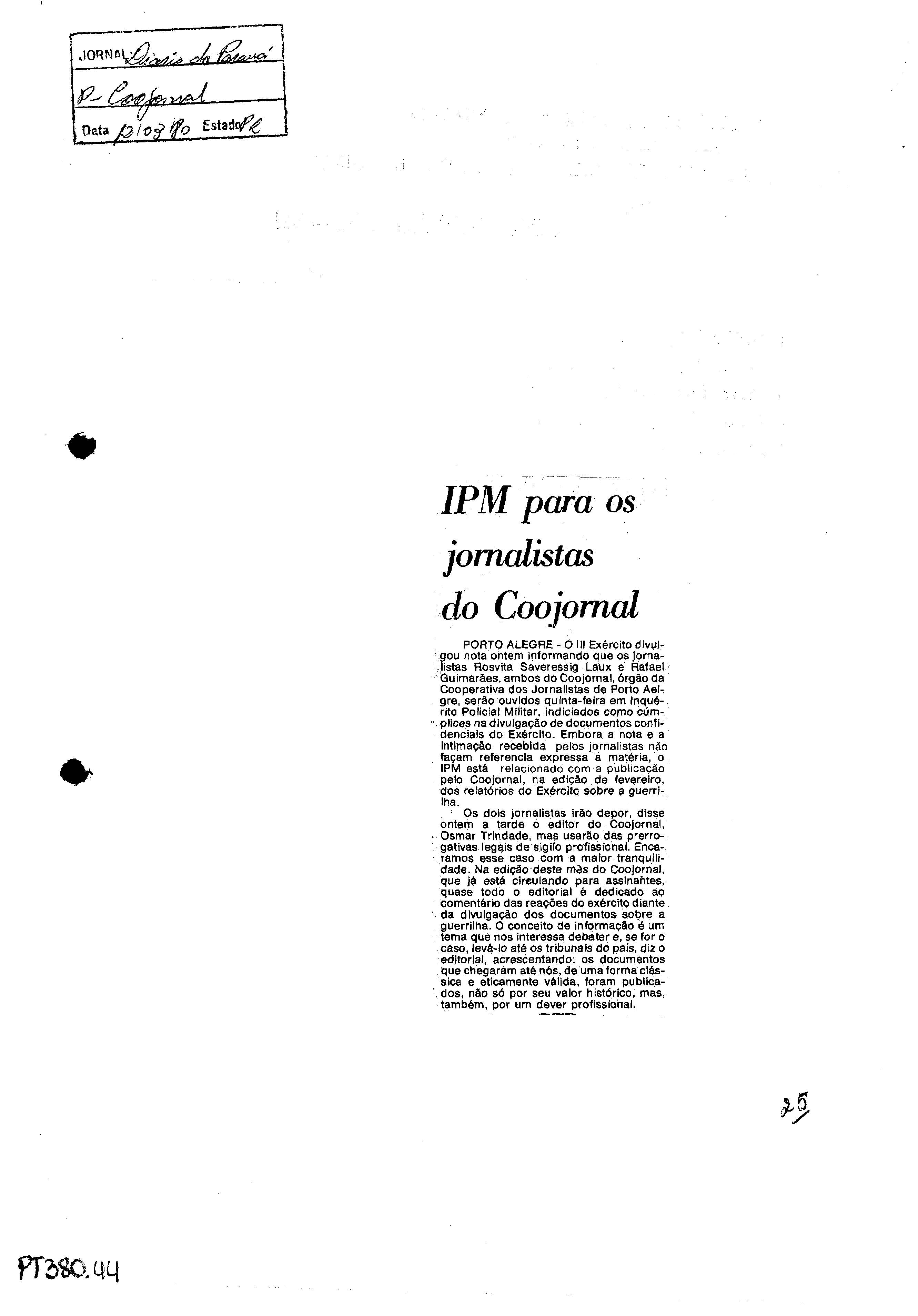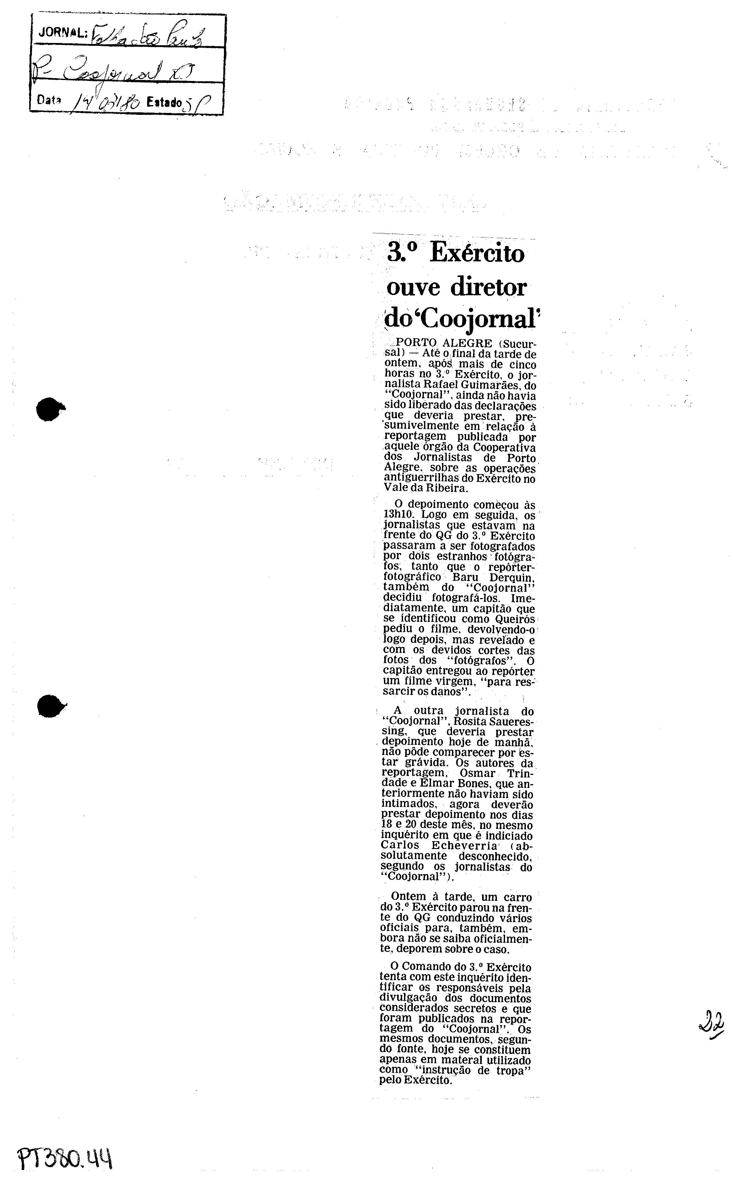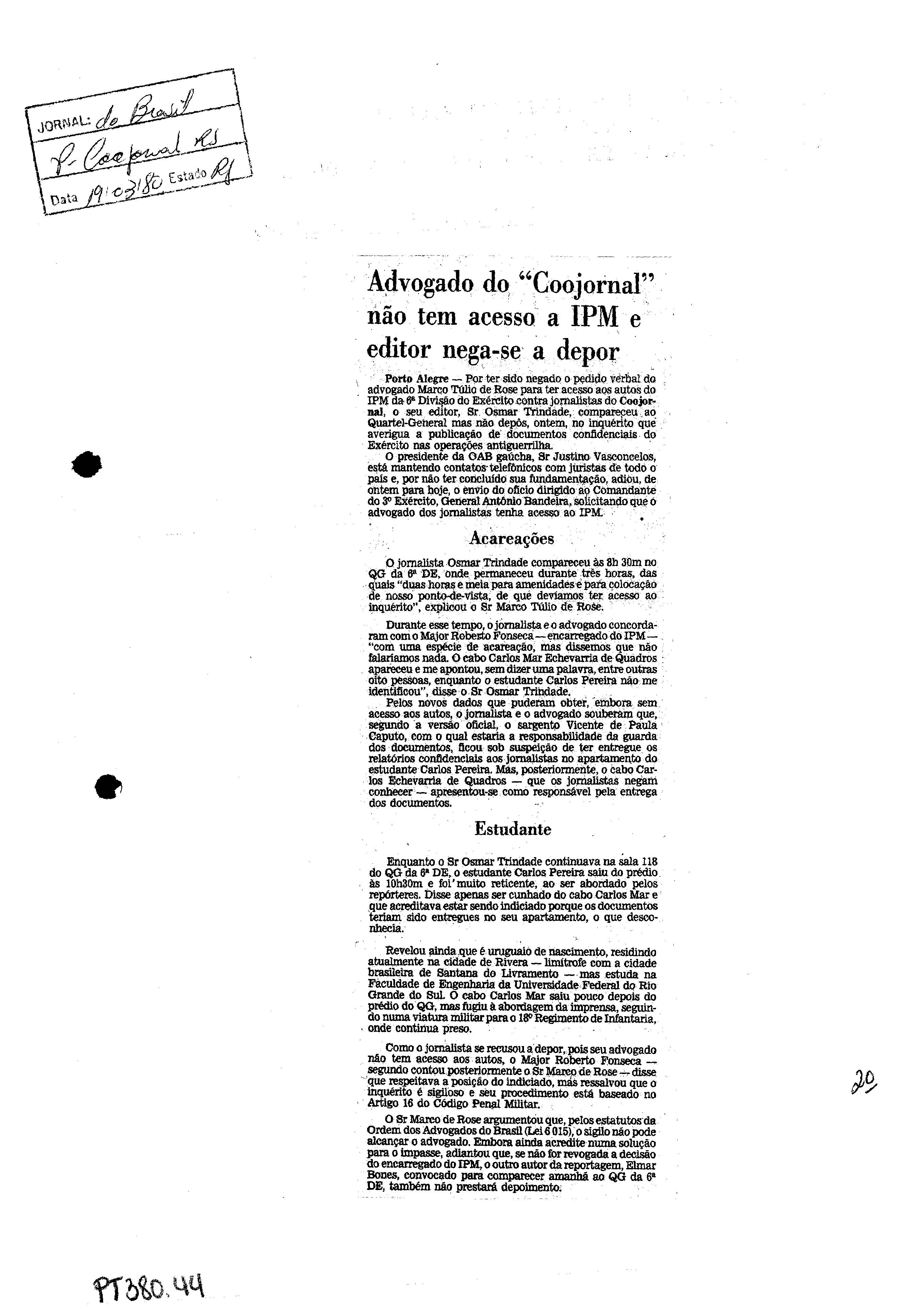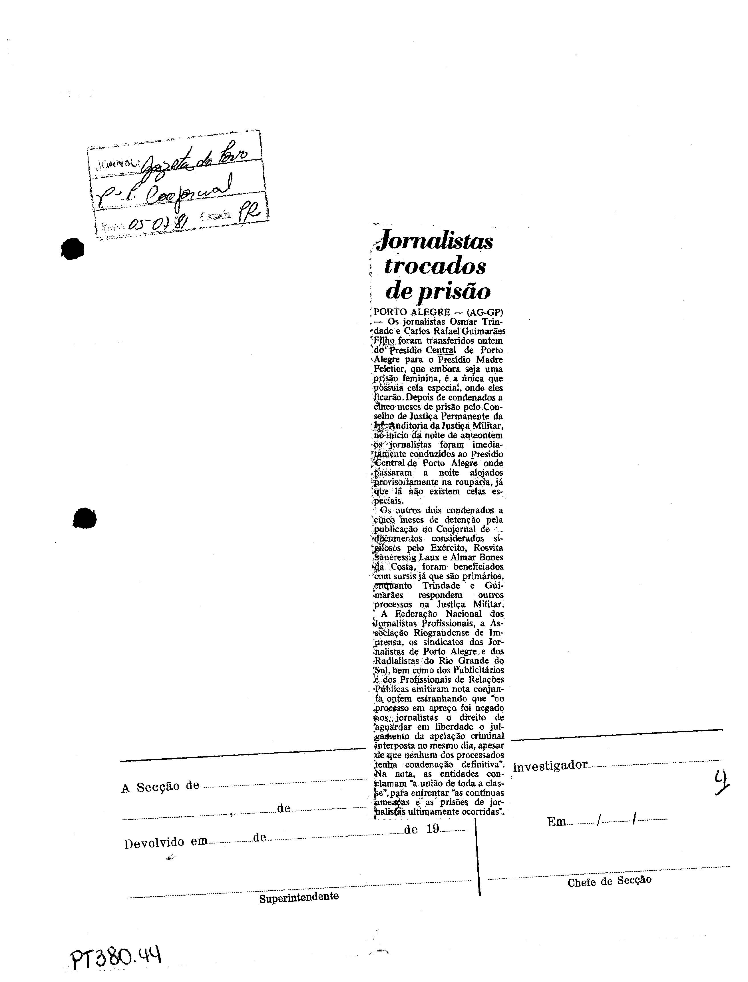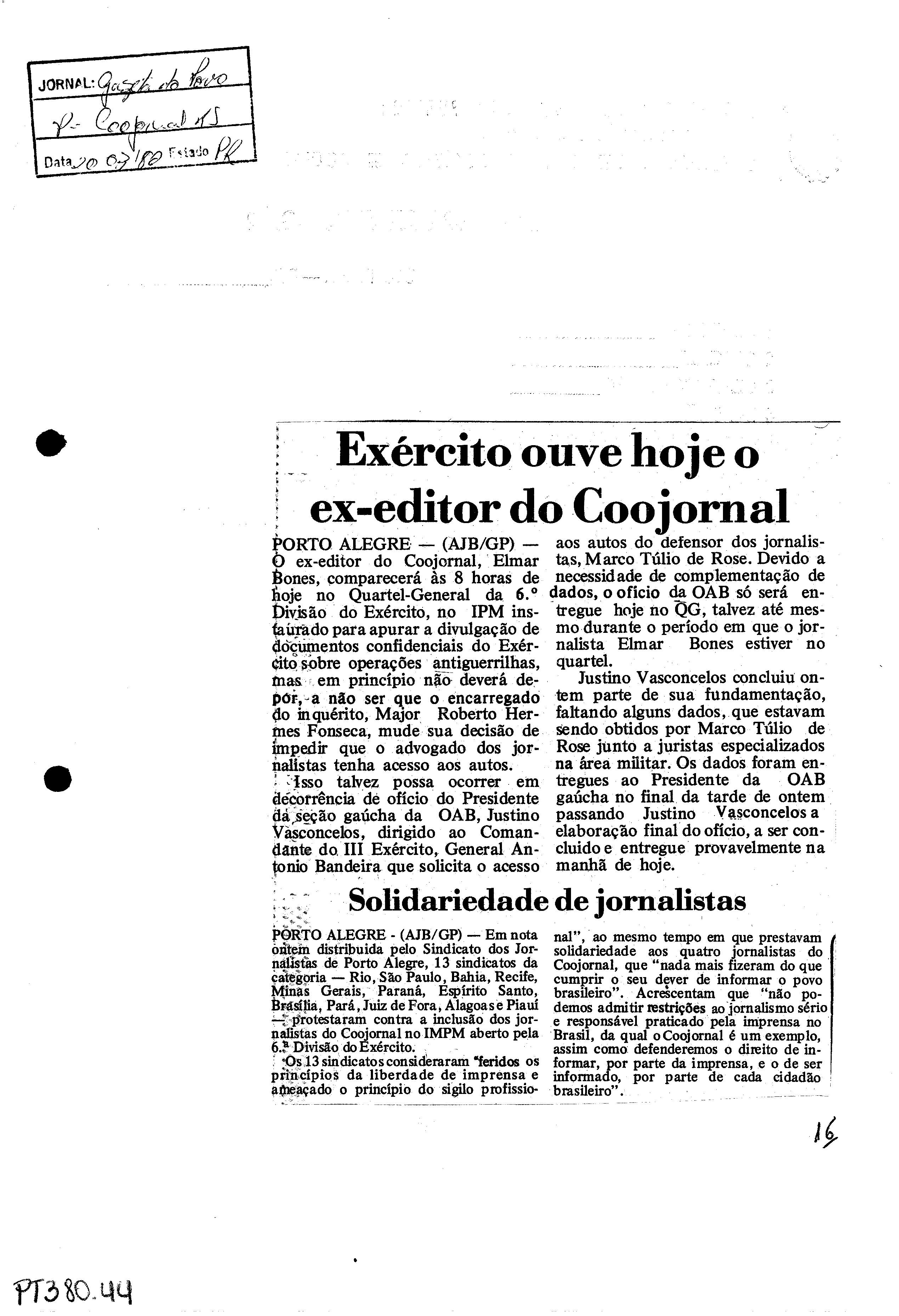 VOCÊ ESTÁ AQUI: HOME » REPRESSÃO » FORÇA S ARMADAS » NOTÍCIAS DAS PRISÕES DOS JORNALISTAS DO COOJORNAL, A IMPRENSA QUE RESISTIU À DITADURA