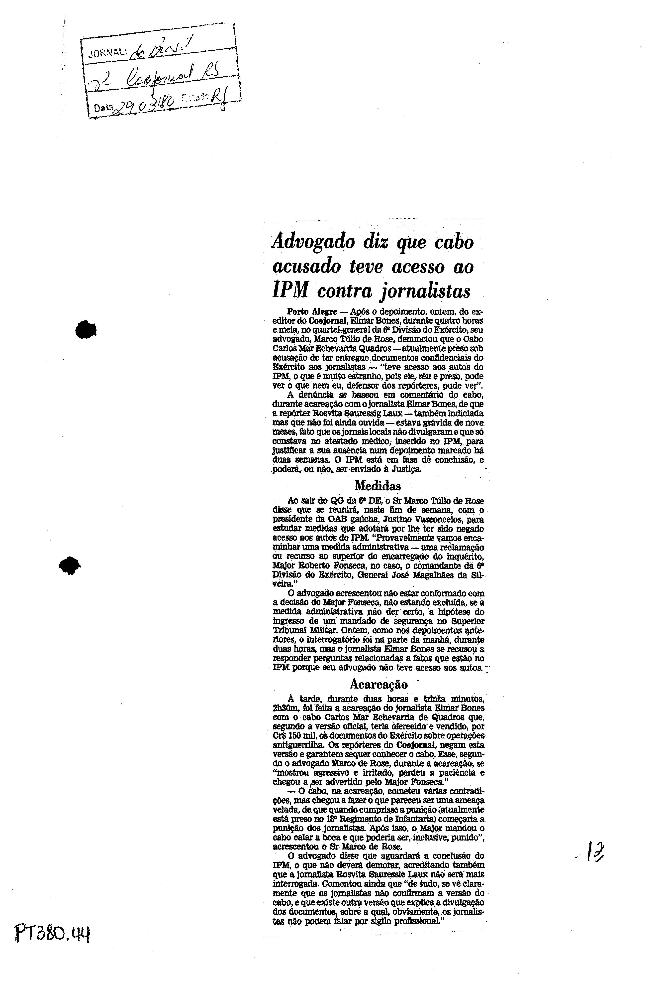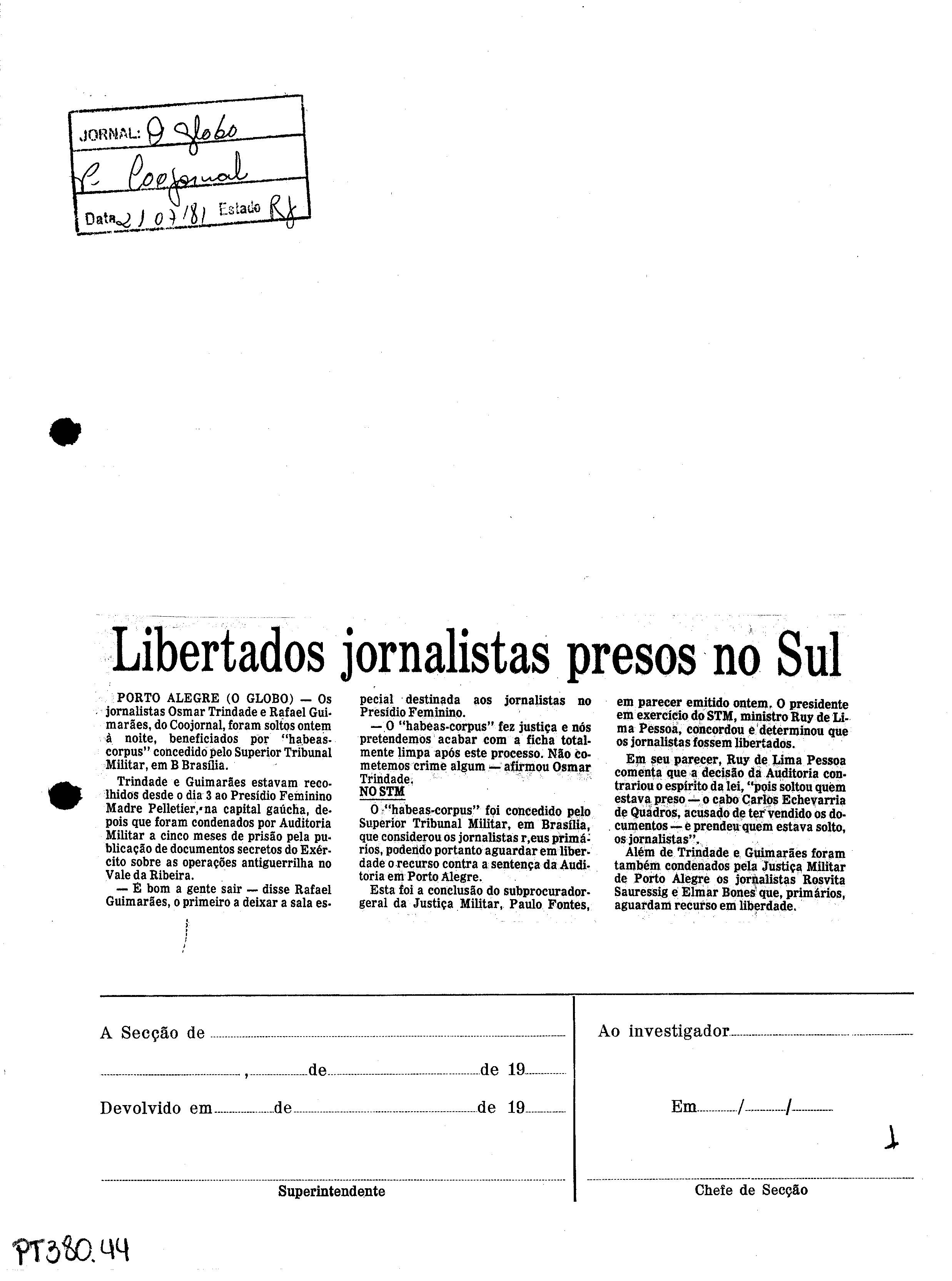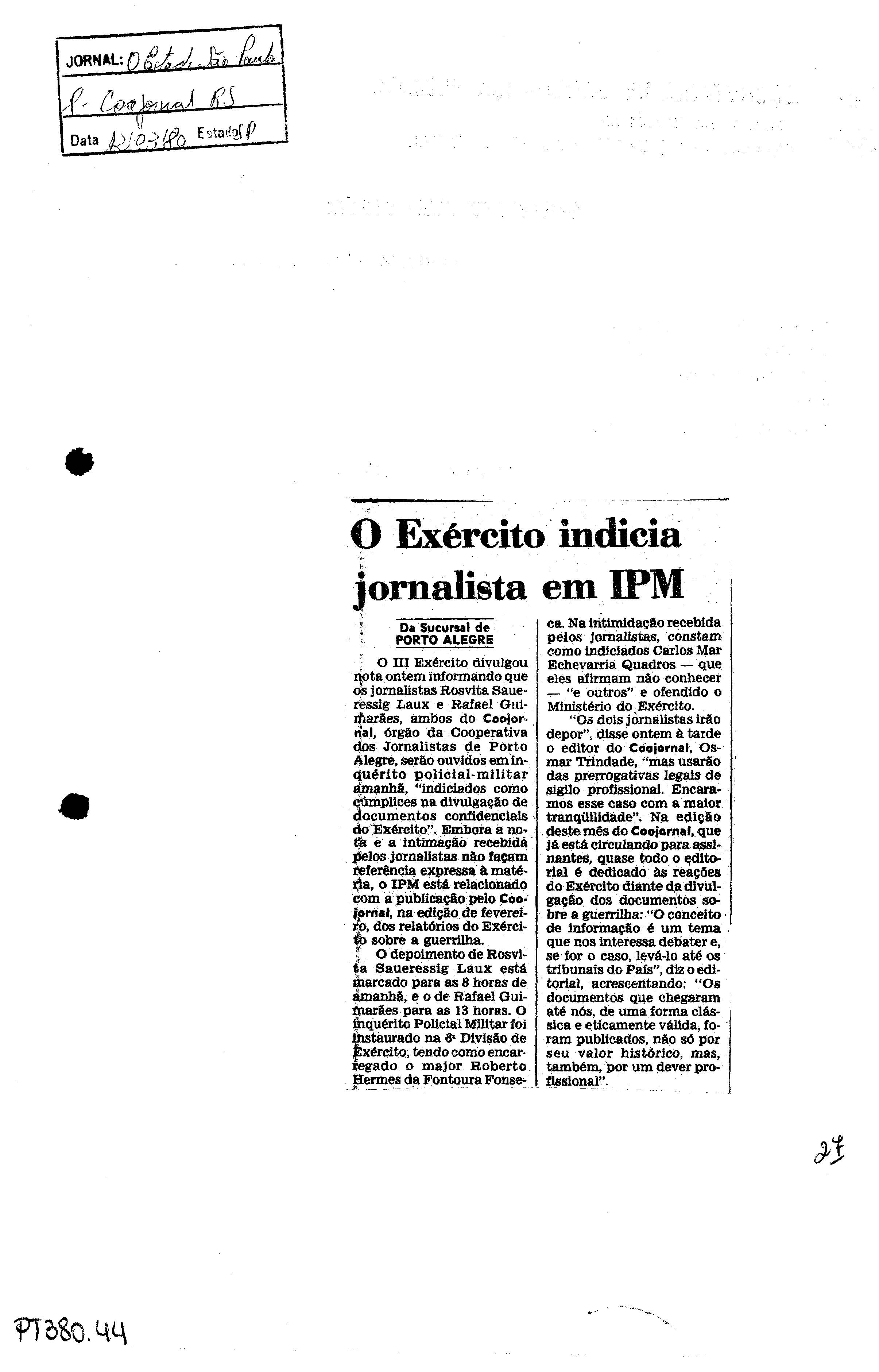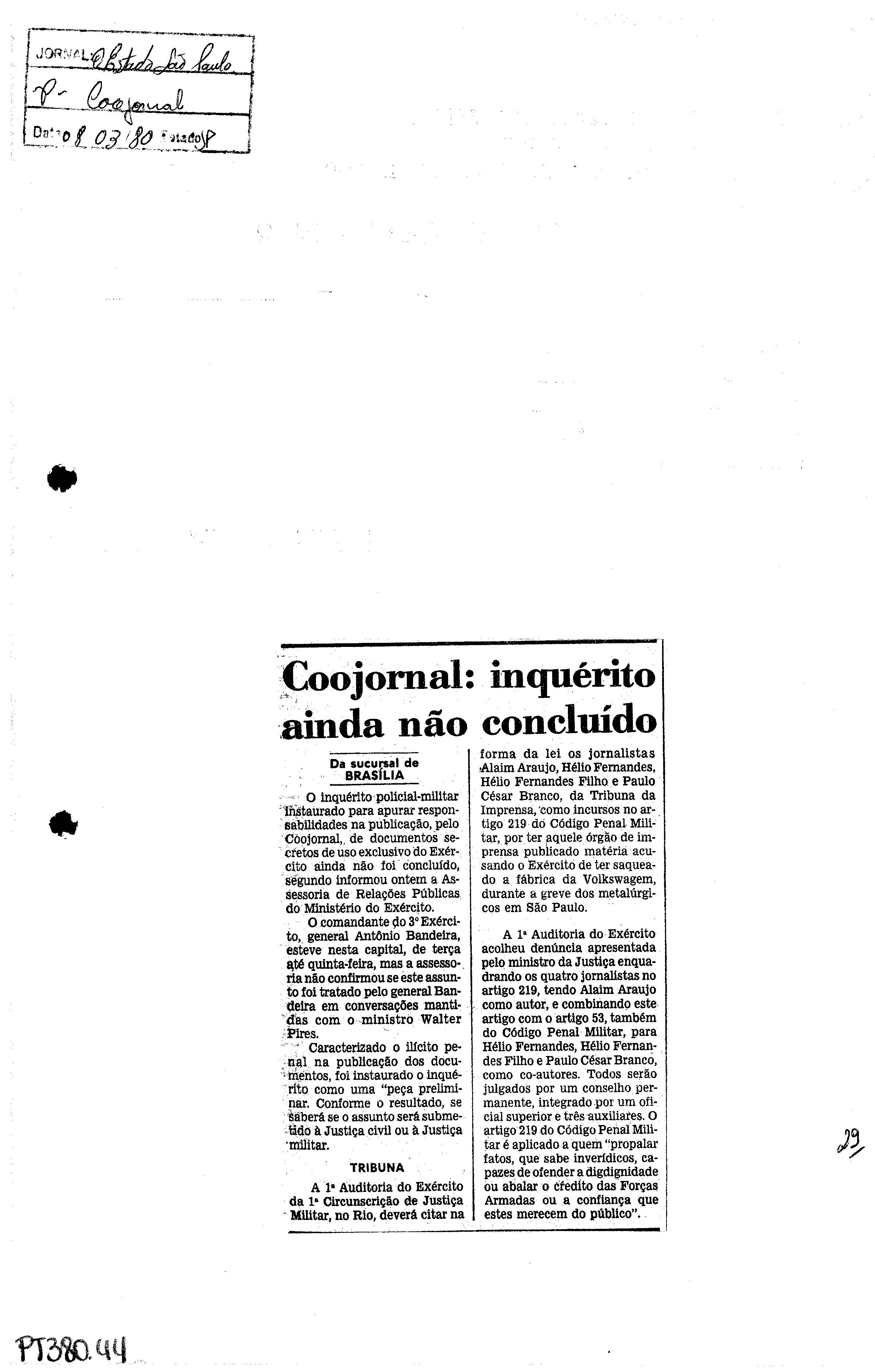 VOCÊ ESTÁ AQUI: HOME » REPRESSÃO » FORÇA S ARMADAS » NOTÍCIAS DAS PRISÕES DOS JORNALISTAS DO COOJORNAL, A IMPRENSA QUE RESISTIU À DITADURA