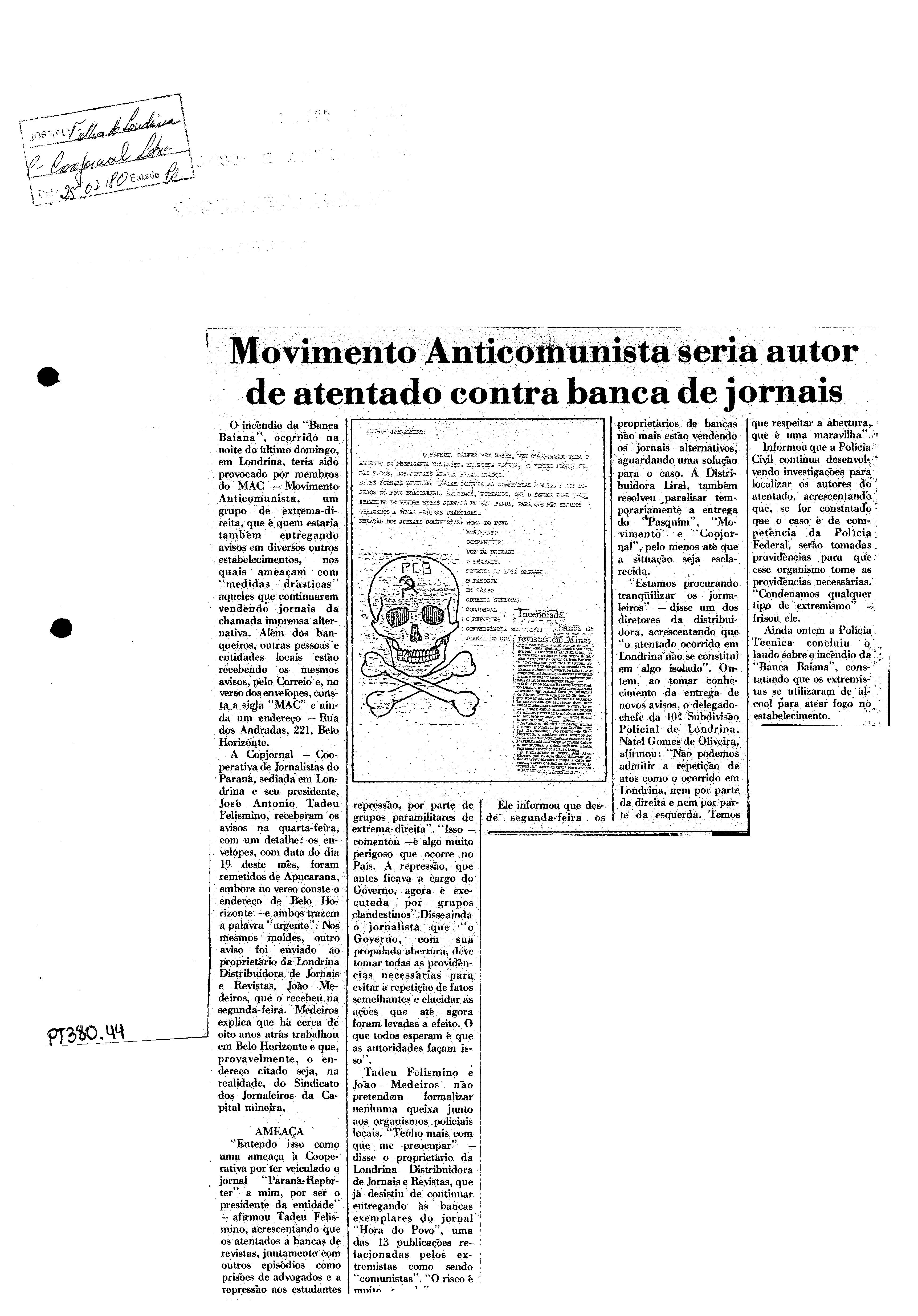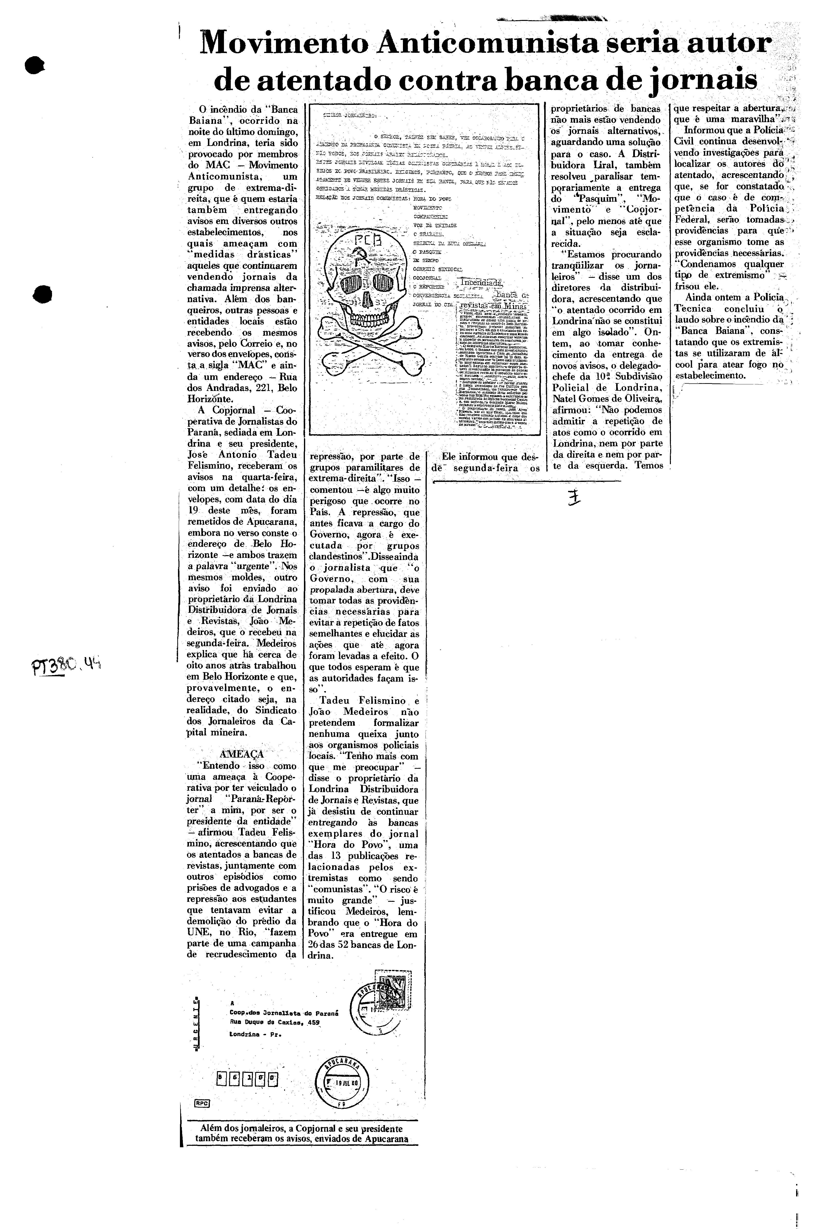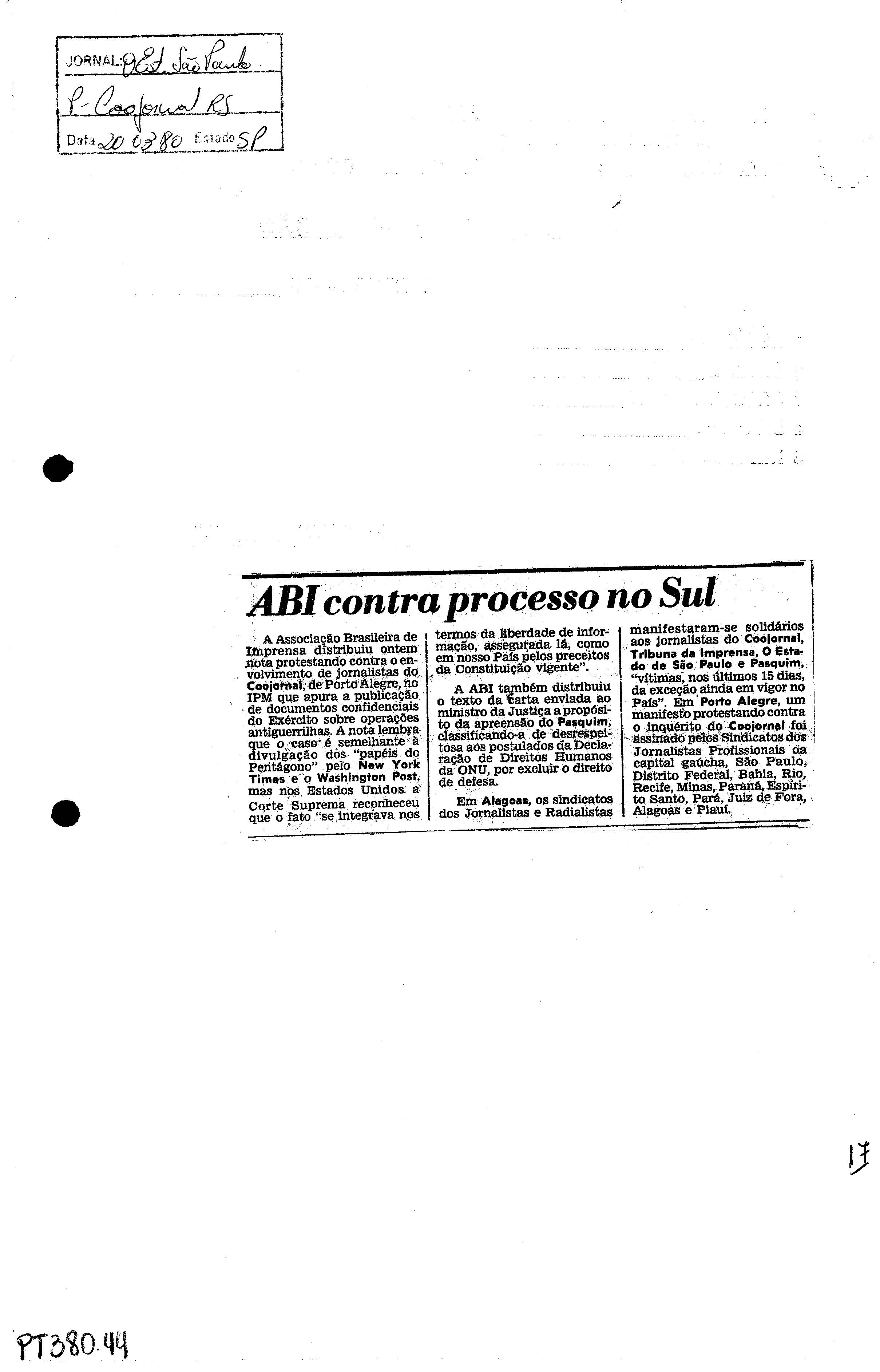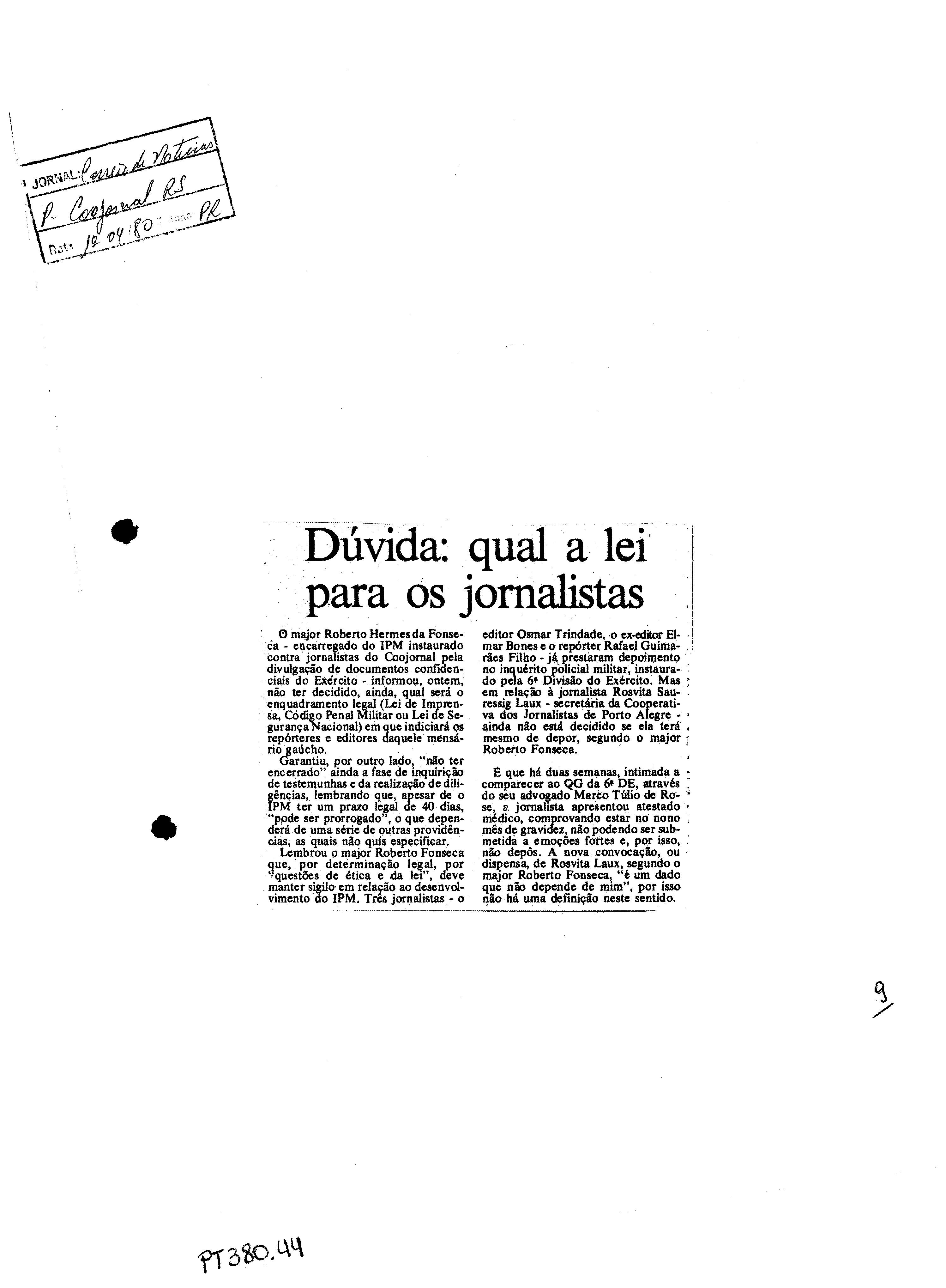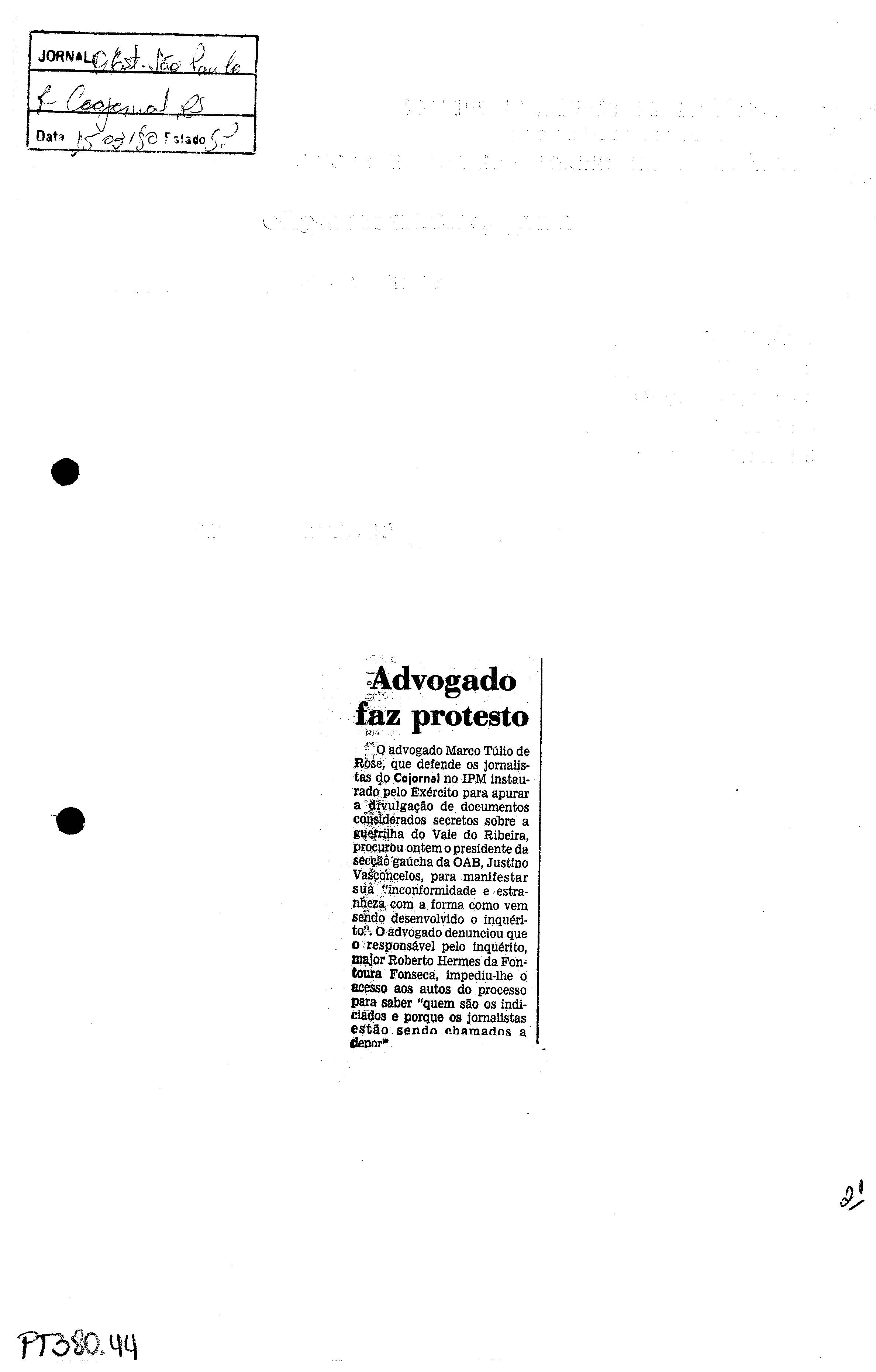 VOCÊ ESTÁ AQUI: HOME » REPRESSÃO » FORÇA S ARMADAS » NOTÍCIAS DAS PRISÕES DOS JORNALISTAS DO COOJORNAL, A IMPRENSA QUE RESISTIU À DITADURA