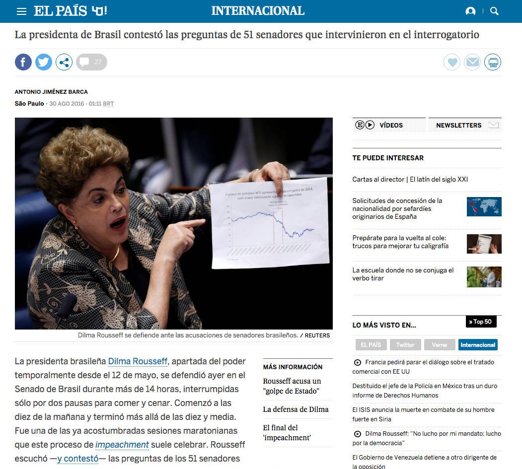 “Ela sabe. Sabe que só um milagre a salvará [do impeachment], sabe que tudo está perdido. Ou quase. Por isso, apesar desta interpelação, Rousseff não dirigiu seu discurso só aos senadores, mas ao país inteiro, aos livros de história, ao seu próprio retrato e à sua própria biografia, consciente da dimensão do momento, da importância do discurso”, destacou o autor do texto, Antonio Jiménez Barca.