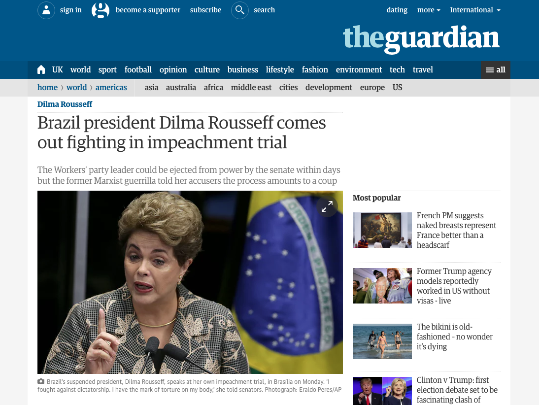 Já o britânico “The Guardian” definiu em sua cobertura que “na sua declaração de 40 minutos, Rousseff serenamente proclamou sua inocência e adotou um tom que oscilava entre a de uma guerreira desafiadora na defesa dos direitos sociais e uma mulher vitimada e injustiçada por seus usurpadores”.