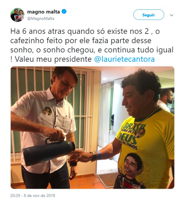 Aí vai: “Ha 6 anos atras quando só existe nos 2 , o cafezinho feito por ele fazia parte desse sonho, o sonho chegou, e continua tudo igual ! Valeu meu presidente”.
